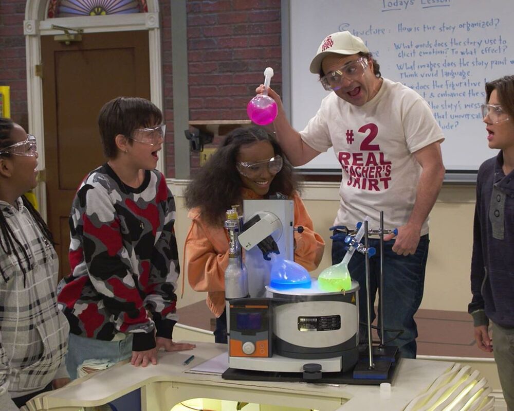 - The name of the creator of the series, Christopher Nowak, is seen in the text on the board in the classroom.